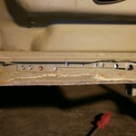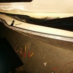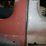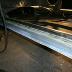 vorne rum......was für ein Gefummel. Die langen Schweißarme mussten dafür drauf, Elektroden anfasen mit der Flex und Fächerscheibe, ausrichten dieser etc.....dauert ganz schön lange. Von innen musste noch entlackt werden, 2 Schweißpunkte fehlen noch, ganz