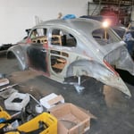 Das Blech wurde dennoch gestrahlt, lasiert mit Zinkchrodingsbums und umgebaut auf schraubbar. Zudem hab ich die Heckschürze mit zwei M6 Einschweißmutttern für den Haubenaufsteller versehen. Fehlt nur noch die Lasche für den Drehgriffschlitten.